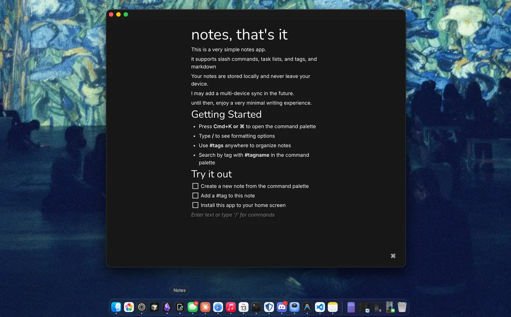 Notes is a note taking app. It supports markdown, slash commands, and even has a command palette you can trigger using cmd+k. It’s also a progressive web app! so you can save it to your home screen or add it to your dock and use it like a native app.
