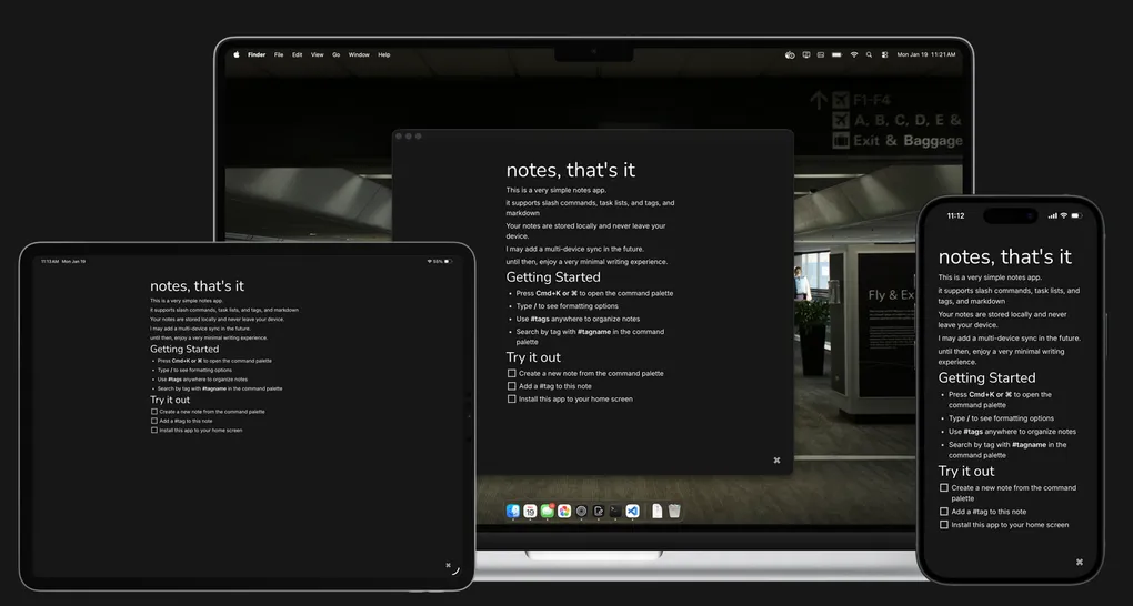 When I built Notes , I designed it to be offline first. I did this for a couple reasons, the first being that I wanted it to be immediately useful to any potential user, no login or landing page to navigate past. The app is the landing page. just pull it up and start typing.